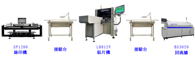 SMT設(shè)備:SP1200 絲印機(jī)、接駁臺、LD812V LED貼片機(jī)、BS3020 回流焊爐。